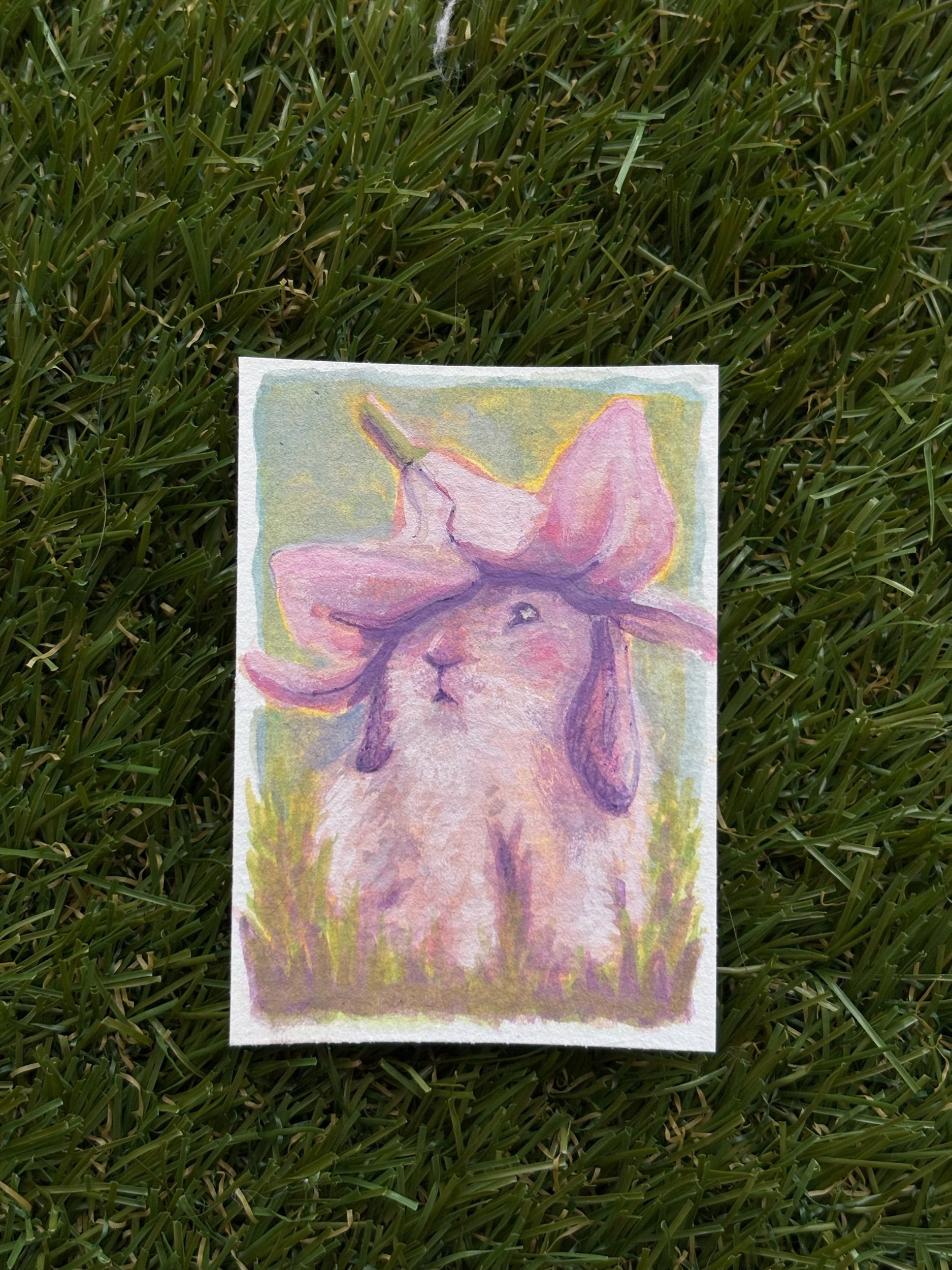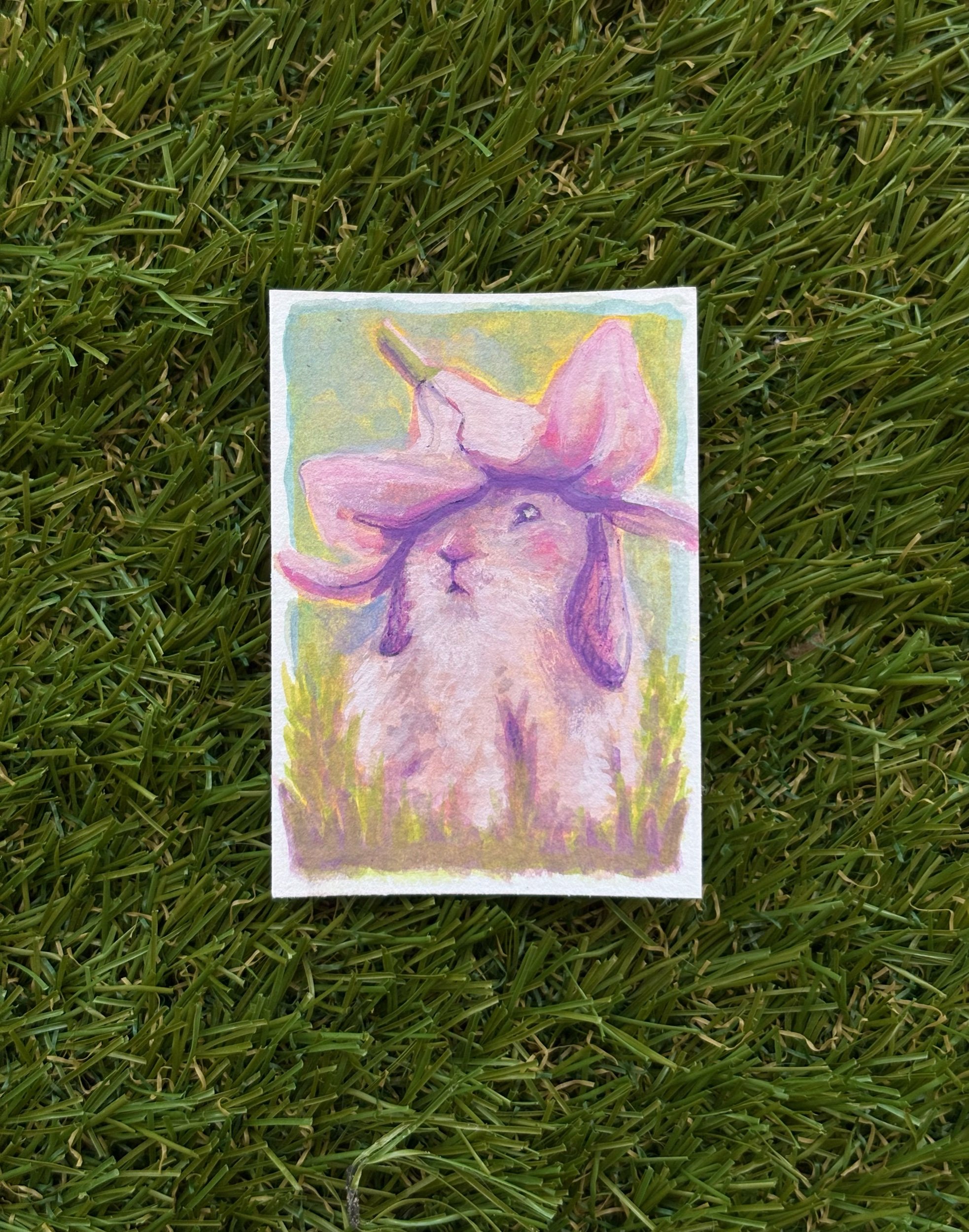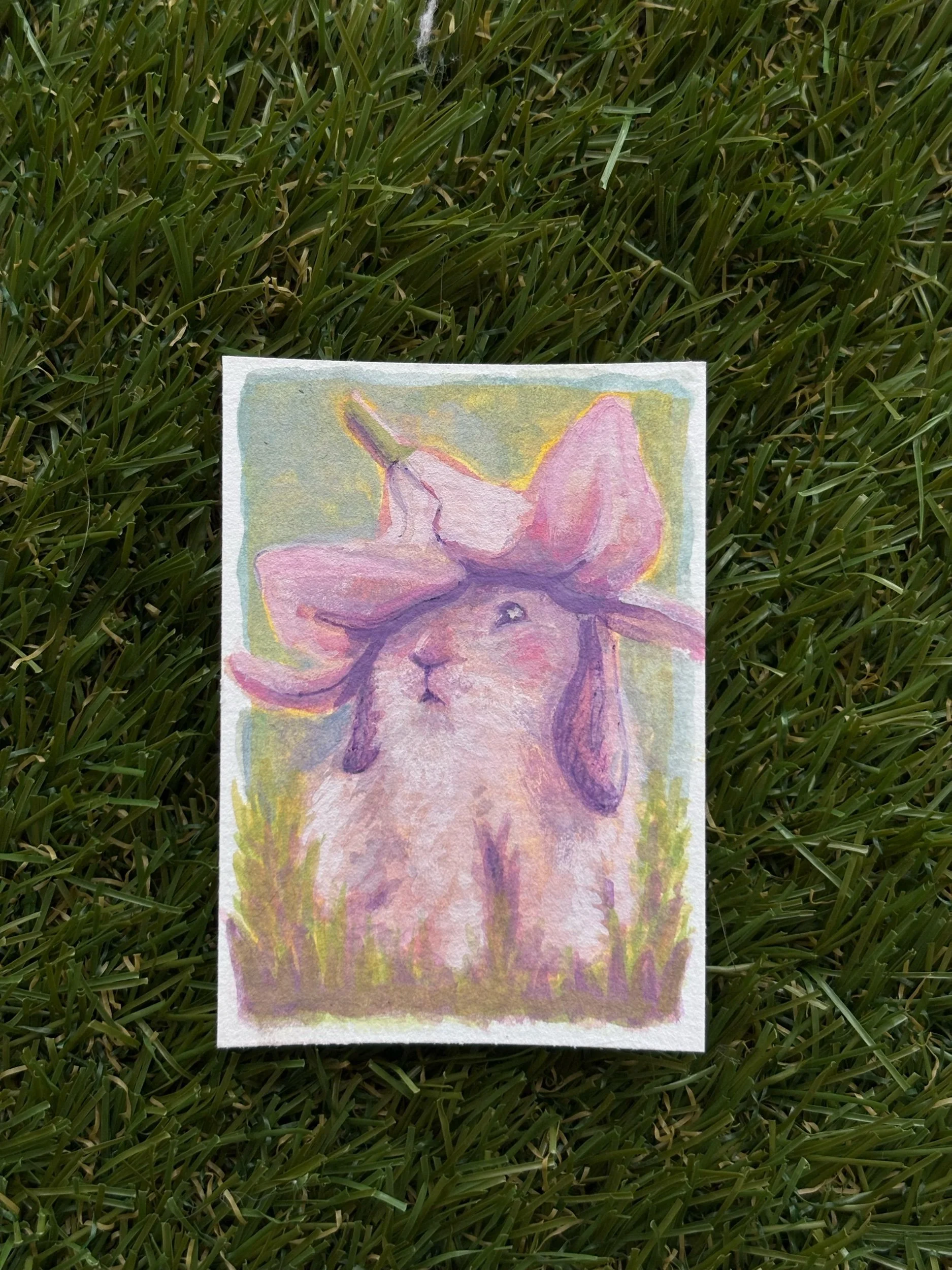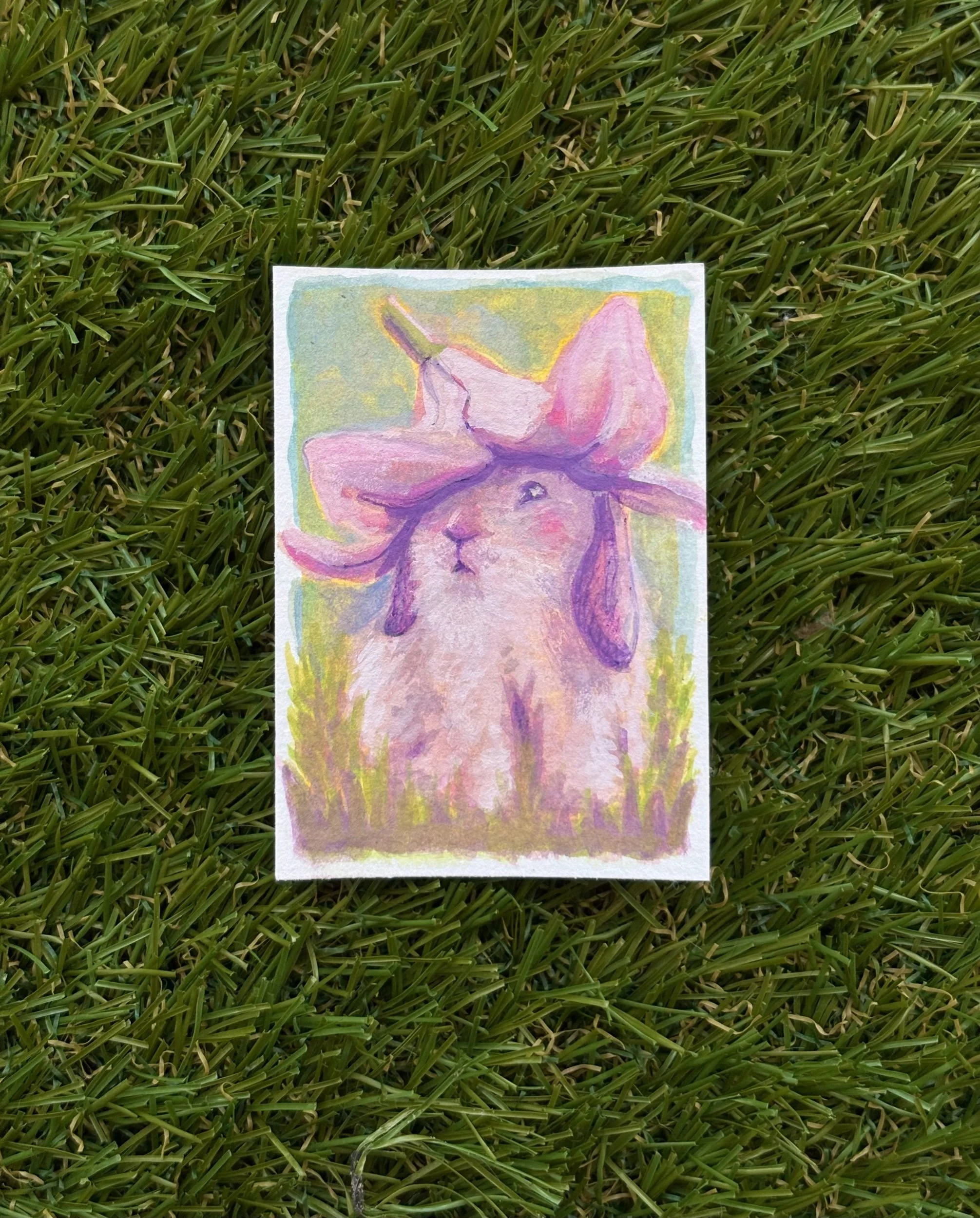 Add a soft, storybook charm to your collection with this original Flower Bunny painting, a delicate 2.5 x 3.5 inch artwork created with watercolor and pen on high-quality paper.