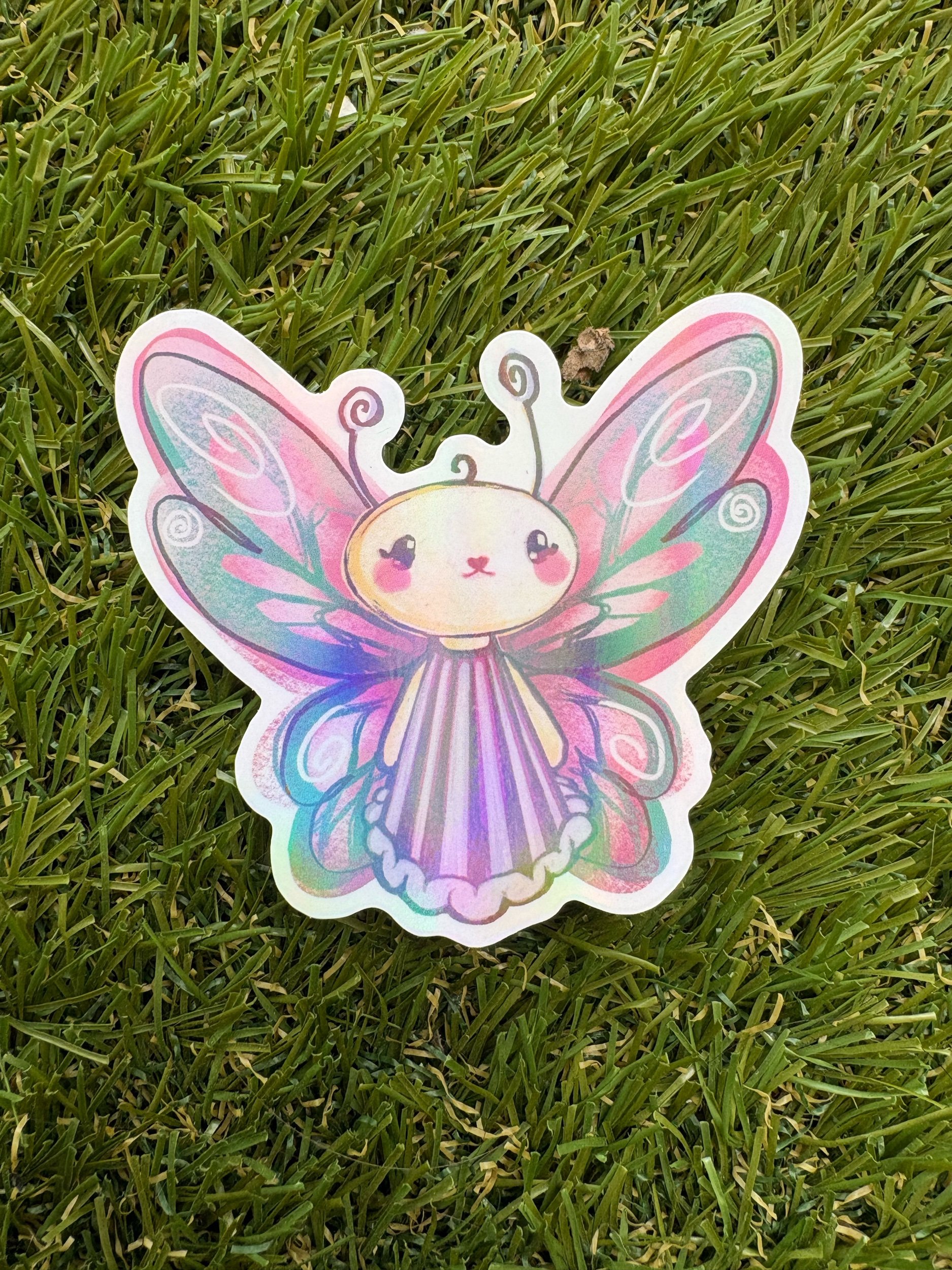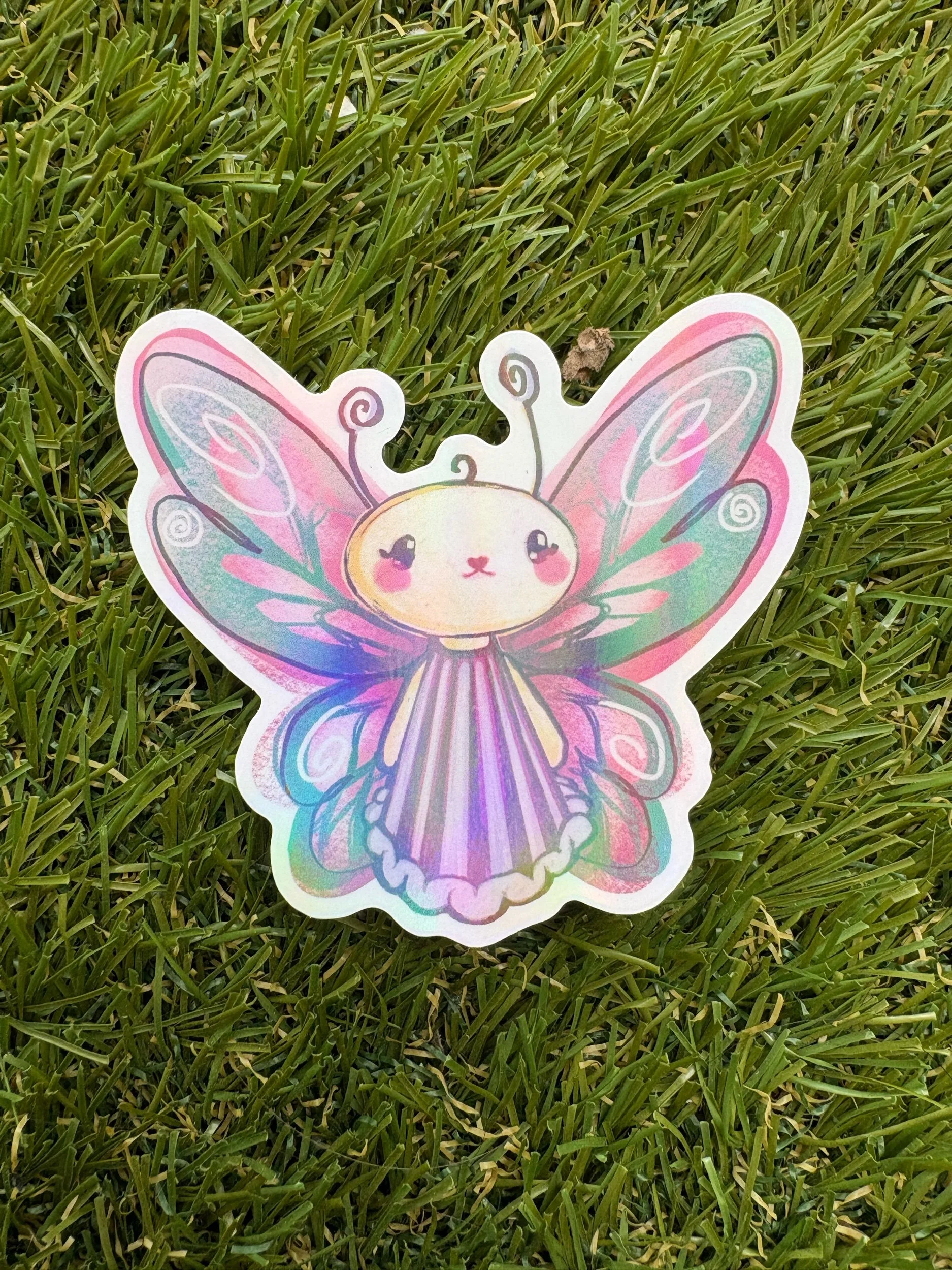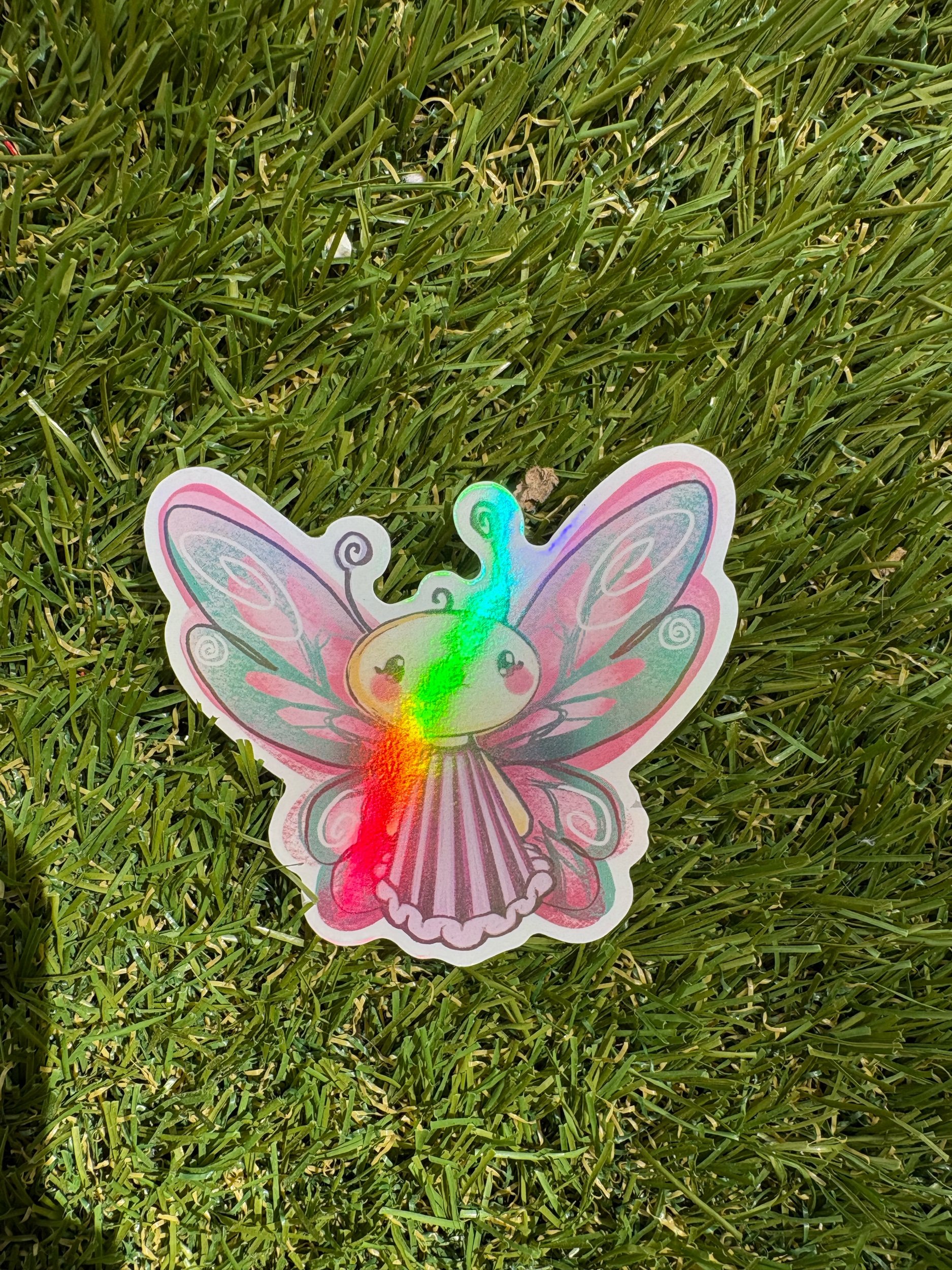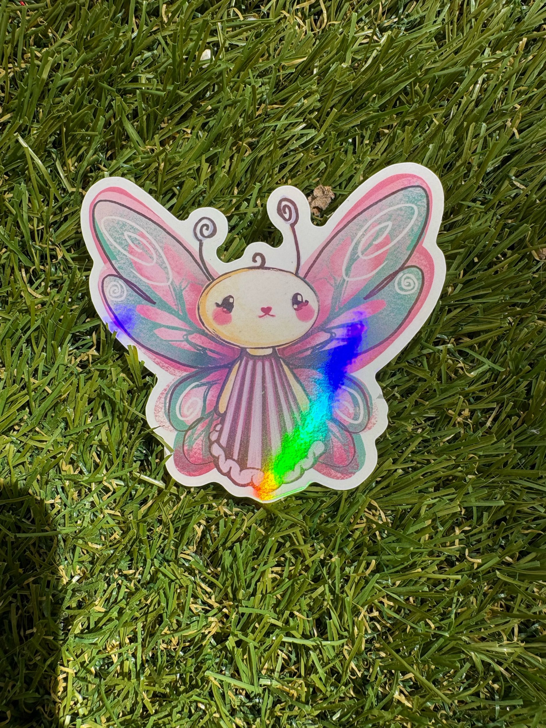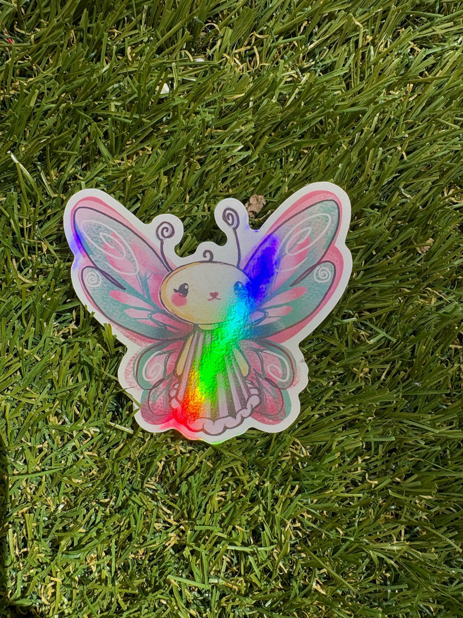 This dreamy, hand-drawn beauty features a delicate butterfly design with a stunning rainbow iridescent finish that shifts and shines in the light. Soft, feminine, and a little magical, sheβs perfect for anyone who loves ethereal, eye-catching details. Stick her on your laptop, water bottle, sketchbook, or anywhere that deserves a touch of sparkle.