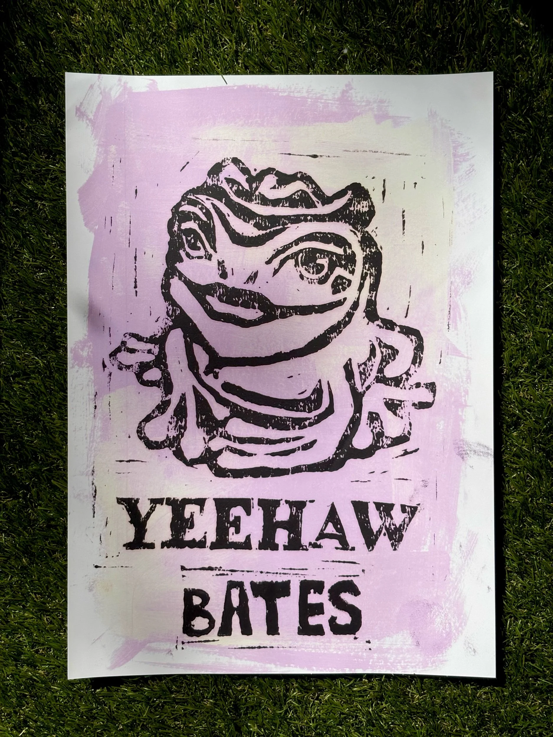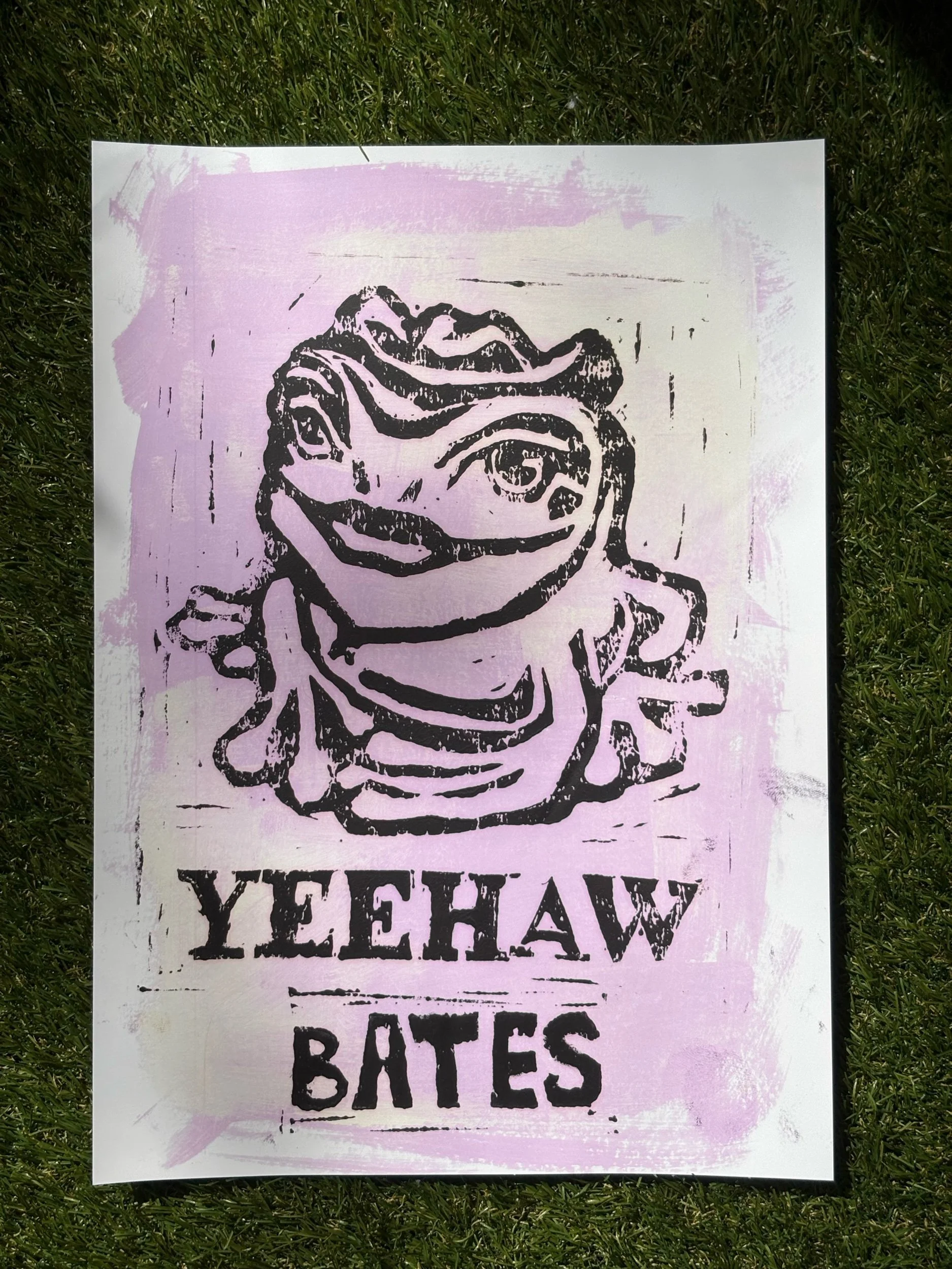 This hand-carved linocut print features a bold black graphic of a cowboy-hat-wearing frog (named Bertha BTW) paired with iconic “yeehaw, bates” lettering. Set against a soft lavender purple and cream background, this piece blends humor, and charm. Perfect for anyone who loves quirky, statement-making art with personality. Hang it up anywhere that needs a touch of fun.